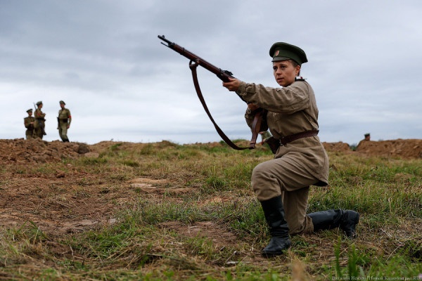 На реконструкции организаторы восстановили эпизод сражения с участием первого женского батальона под руководством Марии Бочкаревой. Женщин на поле сражения отличить от мужчин можно было только по белым погонам, они воевали так же, как и другие солдаты.