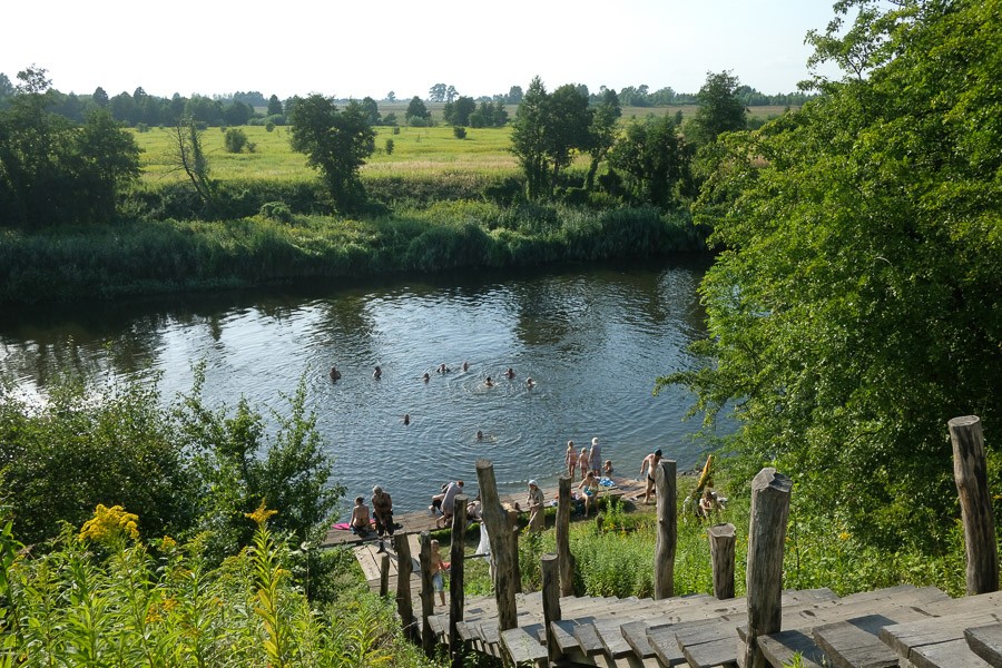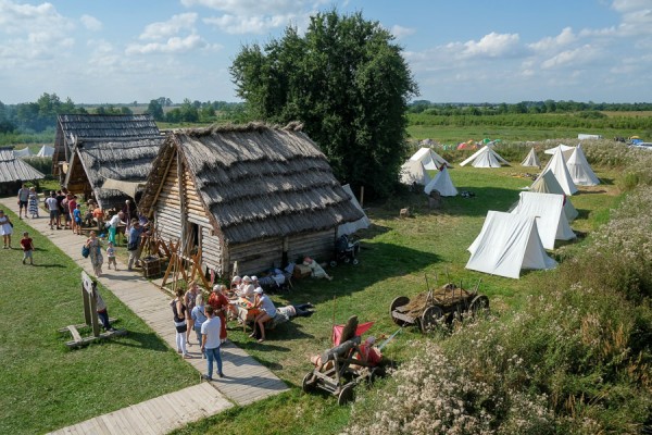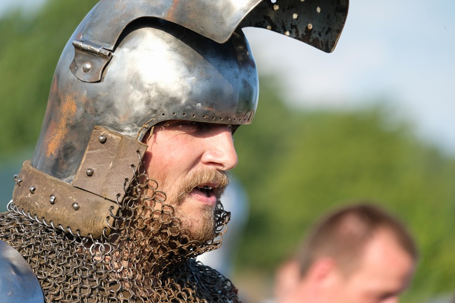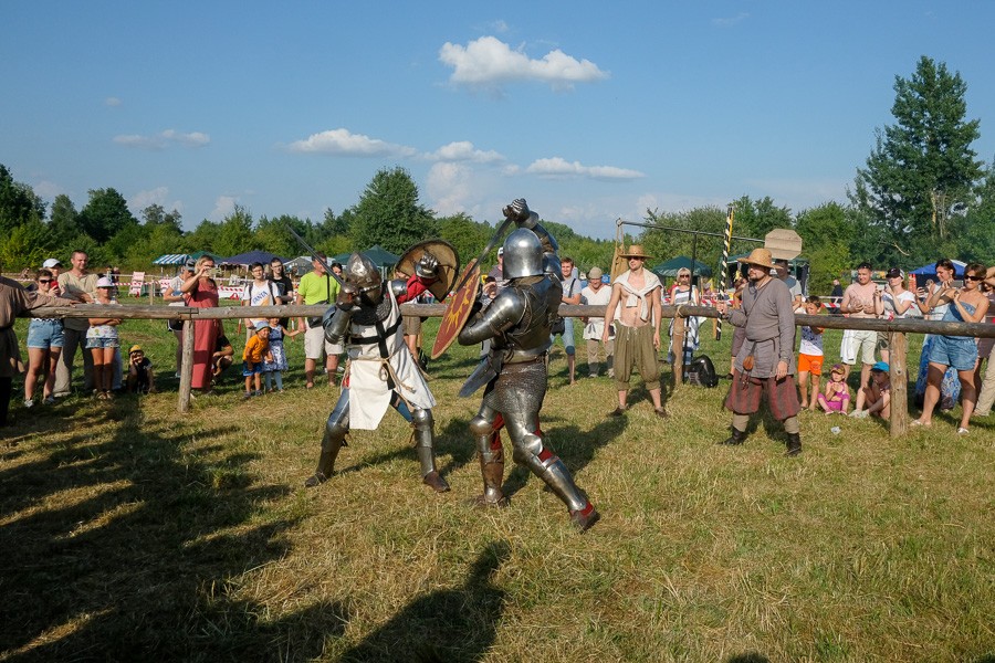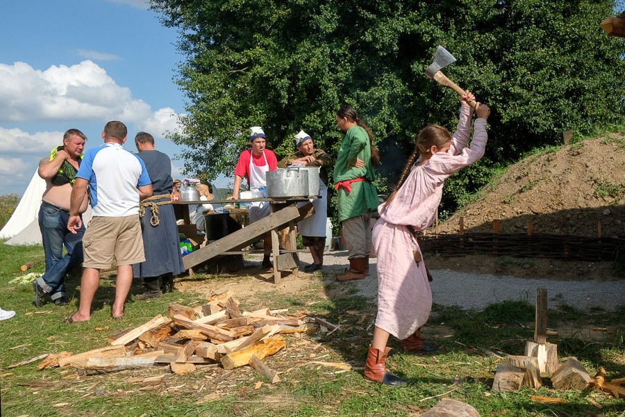 Итак, 3 часа пополудни, невыносимое пекло, зрители и участники передвигаются по тени или лежат на траве под навесами. Самая большая очередь — к палатке с пивом и квасом, оживление наблюдается возле колодца с ледяной водой. Но лучше всех тем, кто догадался захватить купальники и плавки — у них есть возможность искупаться в прохладной Лаве, как бы странно это ни звучало. За городищем раскинулся исторический лагерь, дальше — кемпинг. Яркие туристические палатки несколько инородно смотрятся рядом с белыми шатрами участников. Но на самом деле всё здесь в данный момент — такой околосредневековый фьюжн, где вперемешку современное и средневековое без границ и условностей. Хочешь — изучай старинные музыкальные инструменты и слушай фолк, хочешь — попробуй себя в кузнечном мастерстве; здесь наливают домашнее вино, там — стреляют из лука, осторожнее, не попади под деревянного коня, которого опять куда-то тащат по двору юные поклонники средневековья. «Смотрите, меня убили!», — корчит устрашающие гримасы подругам девушка в колодках (довольно оригинальная и крайне популярная фотозона, кстати).