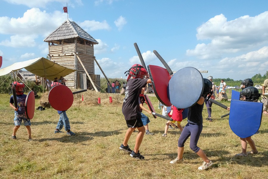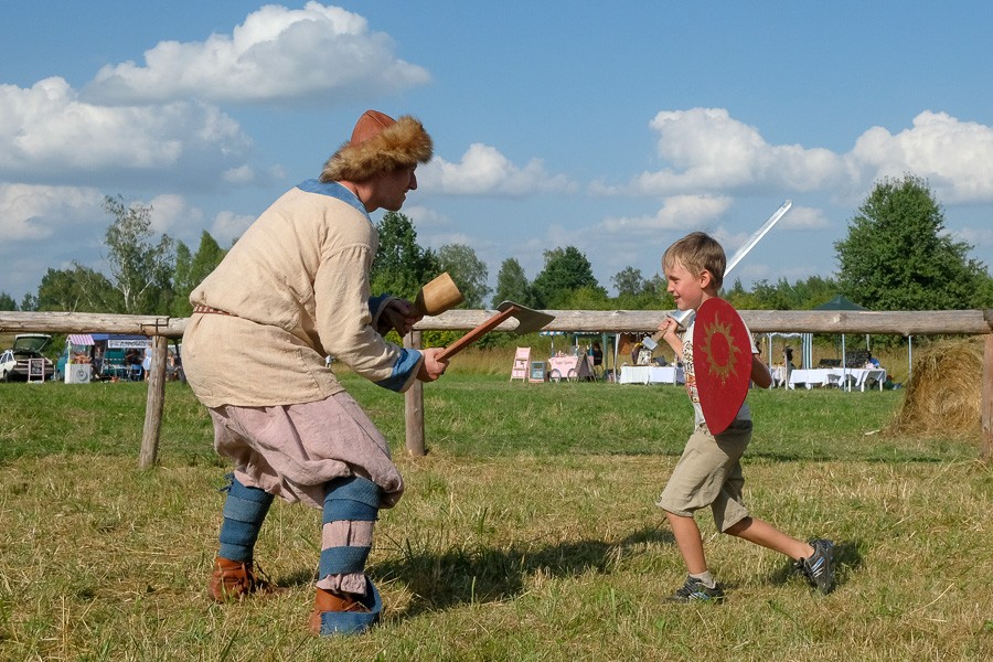 Комфортнее всего, конечно, детям: во-первых, жара им особо не мешает, во-вторых, для них перед городищем целая площадка с развлечениями — можно отмутузить соперника тренировочным мечом (он мягкий и безопасный, к тому же все участники в шлемах и со специальными щитами), можно кататься на качелях, висеть на (или в) клетке, валяться в сене, конь деревянный опять же ни на минуту не остаётся без внимания. Отдельного внимания заслуживает придуманный специально для самых юных посетителей фестиваля квест «Найди героя»: на буклетах нарисованы портреты 8 участников фестиваля, надо найти каждого, выполнить его задание и получить автограф. Потом среди участников квеста будут разыграны призы.