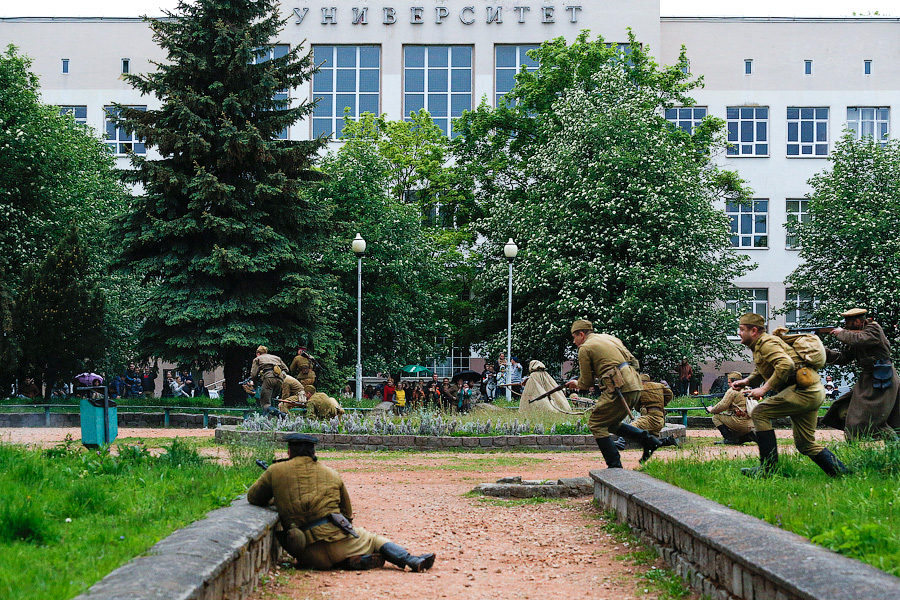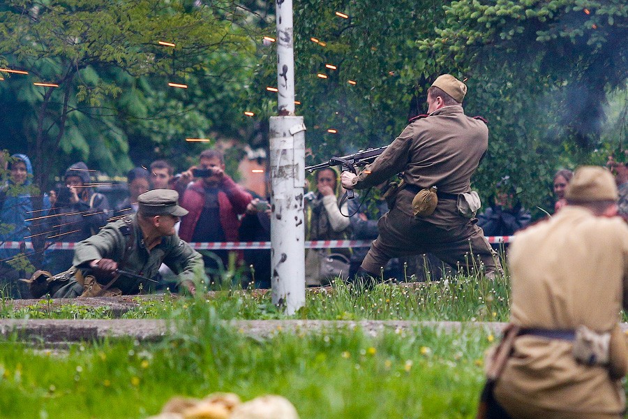 Переходим на другую сторону площадки, откуда видно даже лучше. В 21:00 начинается реконструкция, самый хитрый зритель которой наблюдает за её ходом, сидя на своём балконе в «хрущёвке». Воссоздатели в советской форме сразу же пускаются в наступление, не оставив, таким образом, немецкому врагу ни единого шанса — на радость зрителям. Стрельба почти в одни ворота не нравится разве что автовладельцам — кто же любит, когда сигнализация начинает «пиликать». Громкое сражение длится минут десять, мы подбегаем обратно ко входу в «Блиндаж», откуда под радостные выстрелы выводят сдающегося Отто Ляша — коменданта города и крепости Кёнигсберг.