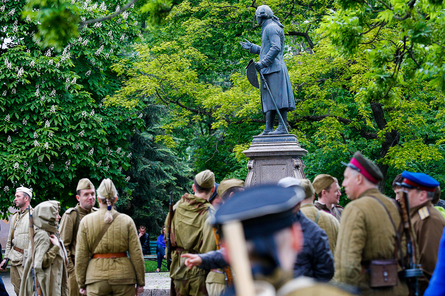 «Все русские, давайте на исходную!» — ближе к девяти вечера кричит один из «русских», обнадёживая нас, что воссоздание апрельской капитуляции 1945 года, начало которой планировалось на 20:00, вот-вот начнётся. Мы идём с ними — в сквер у учебного корпуса БФУ. Здесь и вовсе «день города» — пьют громко и большими компаниями. Впрочем, оказывается, чти эти люди пришли сюда не на «Музейную ночь»: как только на горизонте появляется майор полиции, веселящиеся замолкают и покидают площадку со словами «простите, извините». Благо, поблизости другое место для праздника найти несложно. Полицейский начинает активно с площадки всех выгонять — здесь развернётся стрельба. Выгоняет в том числе и нас. «Не положено!» — у стража порядка на всё один аргумент.