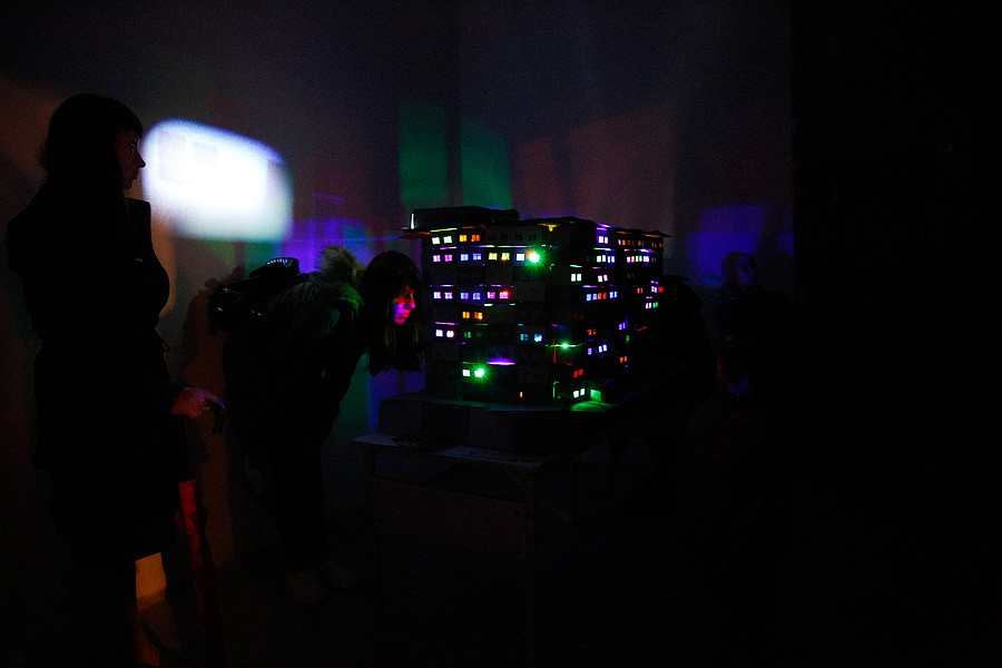 Запомнившаяся деталь: мультимедийная инсталляция «Смотрящий» Константина Тращенкова — макет девятиэтажного дома, в котором, подобно социальным сетям, постоянно происходят коммуникации.