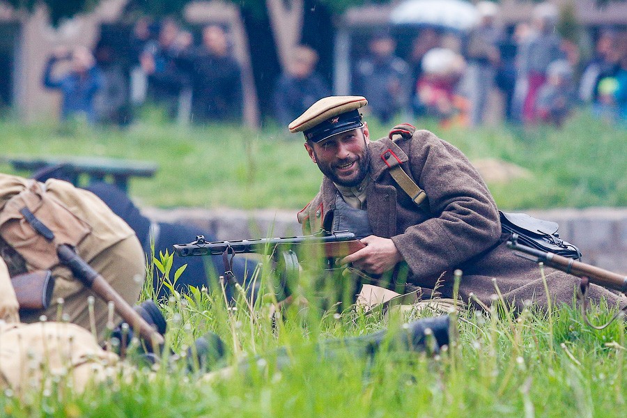 Другая половина пришедших — друзья и родственники. Они пьют баночное пиво, но не все, конечно. Кто-то с характерной осторожностью то и дело достаёт из внутреннего кармана куртки фляжку. Раздаётся громкий выстрел и смущает как раз пытавшегося «незаметно» открыть флягу — хорошо, что он прогремел не во время непосредственной дегустации. А нас оглушает. «А можно мне автомат у вас взять?» — спрашивает у реконструктора один из гостей, вешает оружие на себя и при этом пытается сделать «селфи». «Он вообще-то на шее обычно висит», — с ухмылкой замечает человек в форме советского солдата. Смехом и радостью сопровождаются все сегодняшние выстрелы. На площадке рядом с музеем вообще много юмора. Специфического, реконструкторского.