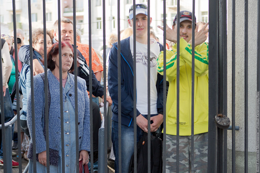 Вход на «Балтику» в семь вечера ещё закрыт. Сказать, что в этот праздничный четверг у пока ещё главной спортивной арены Калининграда собрался весь город, впрочем, нельзя. Несколько сотен болельщиков дружелюбно общаются друг с другом, а вот те, кто постарше, кажется, расстроены больше: «Пригласили и не пускают», — с обидой говорит бабушка двум другим, и все втроём, ничего и не дождавшись, покидают площадку у стадиона. «Скоро вы начнёте веселиться!» — кричит в громкоговоритель девушка-волонтёр в оранжевой куртке. Кричит, надо сказать, довольно тихо.