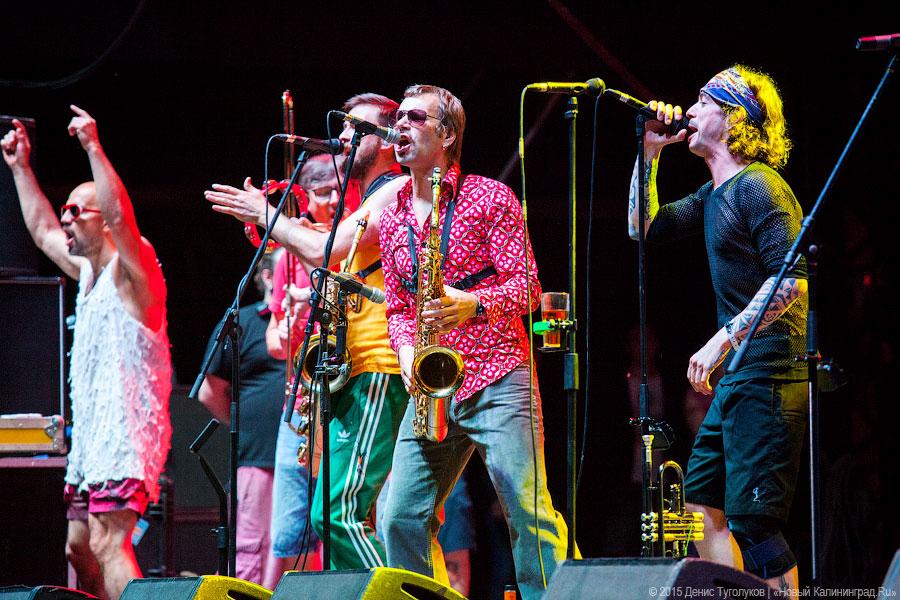 называют группу журналисты РБК) на сцену вышли трубачи, вокалисты, гитаристы, персонажи вроде Александра Адольфовича Пузо и Турбобоя — всего 15 человек. Пропорционально этому увеличилось и число зрителей. До прогнозируемых десяти тысяч, правда, было далеко, но вопросов вроде «для кого здесь играть?» у музыкантов, скорее всего, не возникало.