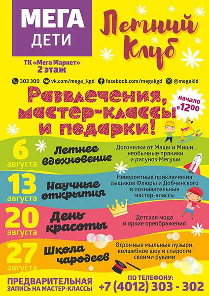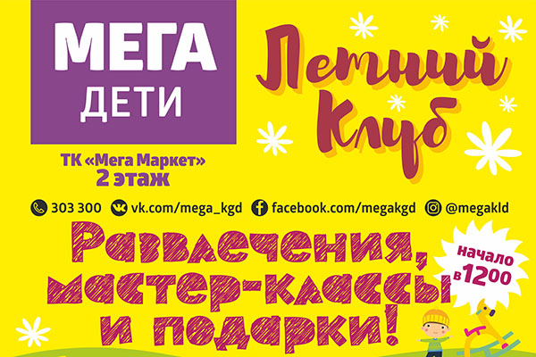 Летний клуб «Мега Дети» будет работать каждую субботу до конца лета в 12.00 в ТЦ «Мега Маркет» по адресу: ул. Уральская, 18, 2-й этаж.