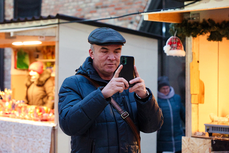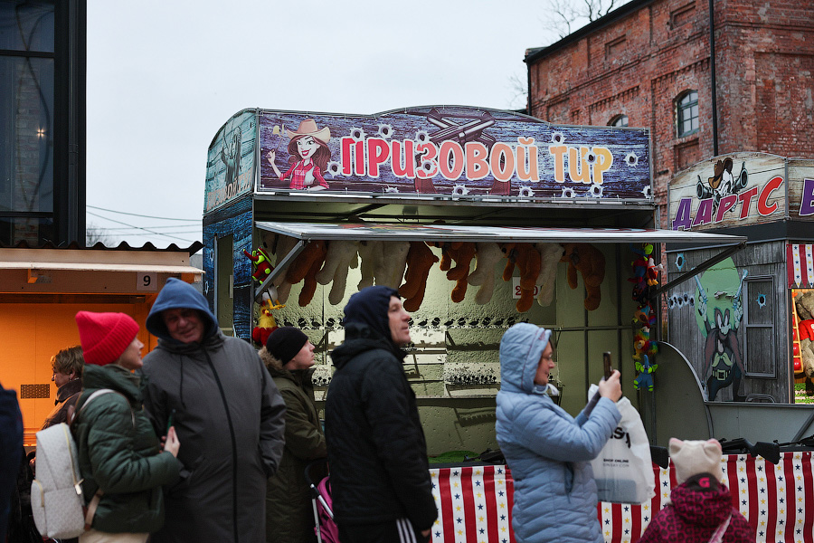 Посетителей пока немного. В толпе то и дело можно заметить снующих рабочих — кто-то продолжает монтаж ярмарки, кто-то отделывает внутренние помещения «Понарта», который по задумке инвесторов должен превратиться в многофункциональный комплекс с кафе, ресторанами, офисами, спортивным и детским центром, торговой галереей и парочкой музеев. Набор ярмарки привычный. Здесь торгуют праздничными мелочами вроде вязаных снежинок или тряпичных кукол, копчёной рыбой, козинаками и маслами, мёдом с пасек Зеленоградского и Багратионовского районов, мясом, сырами местного производства — от неманской качотты до халуми родом из посёлка Волочаевское. Халуми жарят сразу при покупателях, и на ближайшие пару метров разносится нежный молочный запах. На этом ассортимент еды заканчивается, если не считать два скромных фудтрака с хот-догами и бургерами у входа на бывший пивоваренный завод.