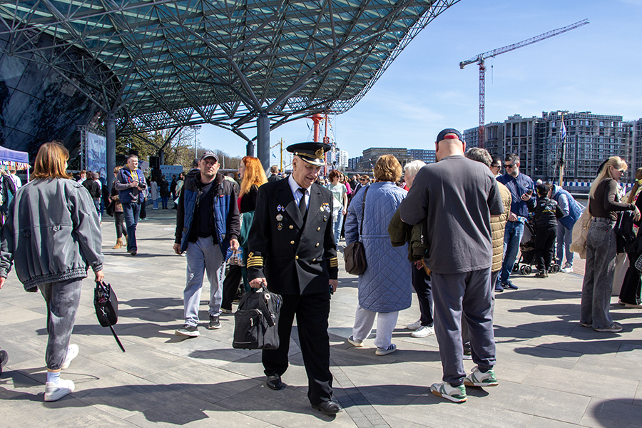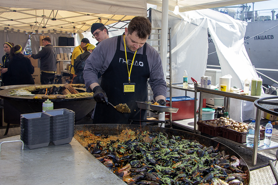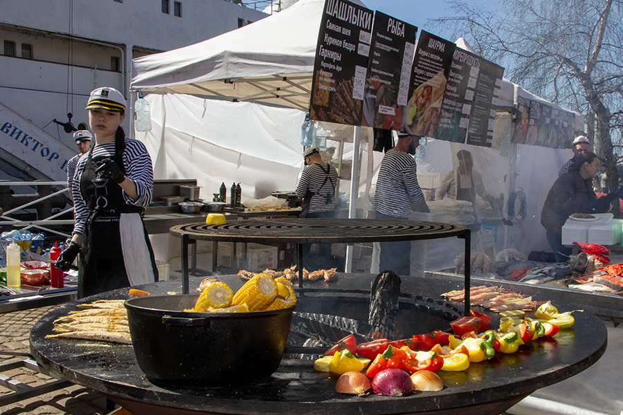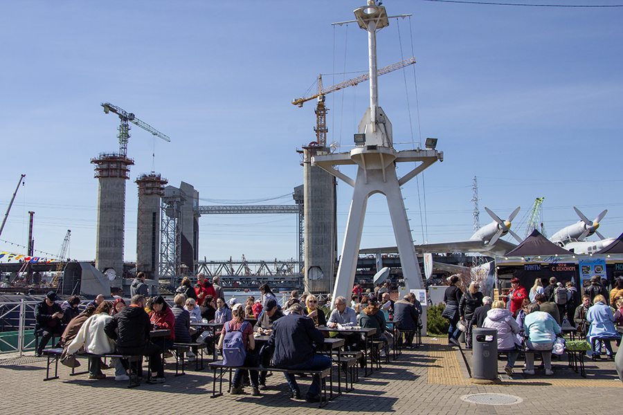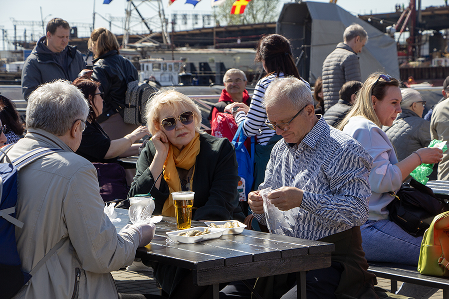 ...К обеду народа на набережной Петра Великого значительно прибавилось. Стало очевидно, что территория Музея Мирового океана, если и может вместить всех желающих, то с трудом. Временами казалось, что находишься в переполненном автобусе, который в час пик застрял в пробке. Однако недовольных этим обстоятельством замечено не было. Как и тем, что за едой и напитками приходилось выстаивать длиннющие очереди. Не всем, как, например, автору этих строк, хватало терпения пройти этот путь до конца, но причиной для расстройства это не становилось. Впрочем, добыть разного рода вкусности — это всего лишь полдела. Надо было еще найти место, где всё это можно было спокойно съесть.