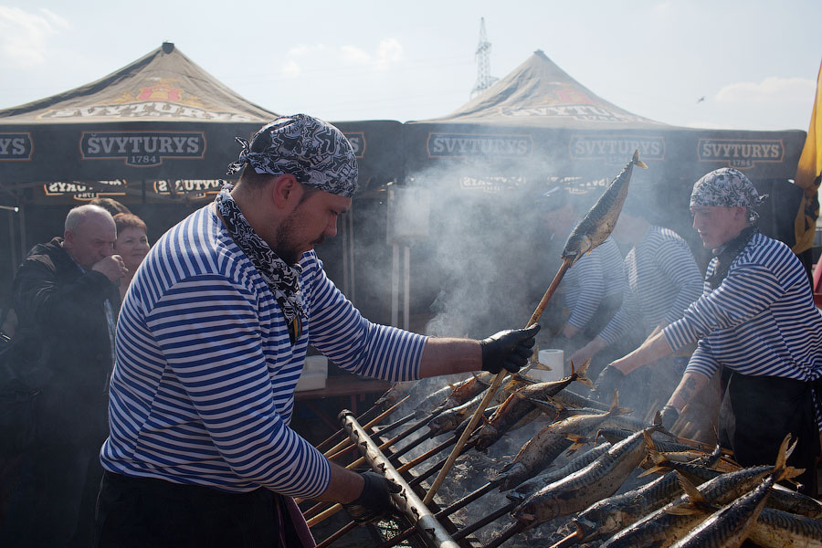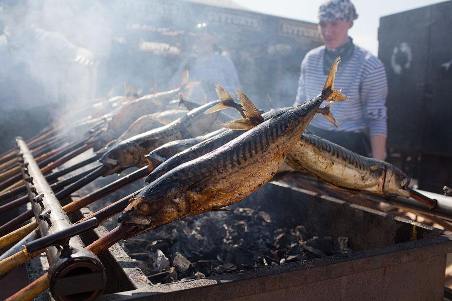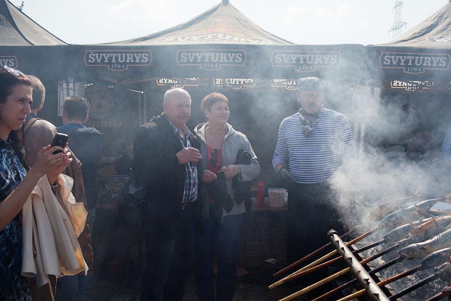бывает обычно. Прилавки не страдали от нехватки палтуса, леща, судака и угря; Куршская коса предлагала рыбу на дровах; другие местные умельцы коптили скумбрию на шпагах. За всем этим, само собой, выстраивались очереди, но им удивительным образом удавалось обходиться без истерик и нытья. Местами стояли и за шашлыком, но без ажиотажа.