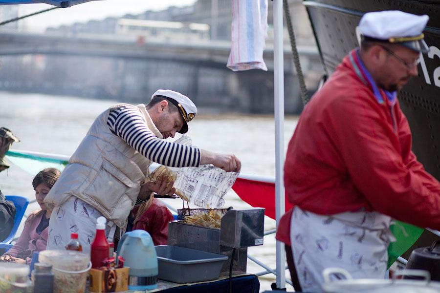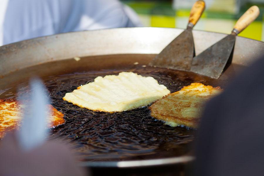 Ну, во-первых, потому что в этот раз организаторы постарались обойтись без селёдки под шубой, белесого соуса во всех его проявлениях и других традиционных угощений в виде самсы, расстегаев и блинчиков. Нет, при особом желании, конечно, можно было всё это найти, заплатить по 15 рублей за порцию кетчупа (отдельные гости праздника так и поступали). Но обнаружить пункты продажи салатов и выпечки из постсовковых столовых было непросто — все они спрятались куда-то на задворки. Симпатичный фастфуд на глаза попадался чаще: ливанские пироги, сэндвичи (один из них — с селёдкой и луком — мы попробовали и остались очень довольны), красочная выпечка.