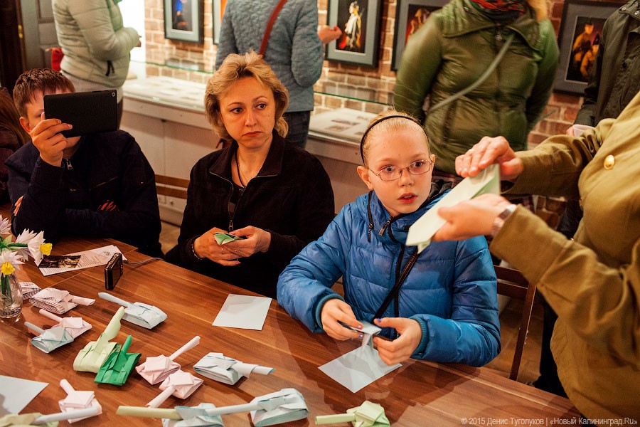 Дальше всех на пути к милитаризации праздника пошли во «Фридландских воротах». Тамошние организаторы устроили мастер-класс по изготовлению танков из бумаги. На деле практические занятия ничем не отличались от обучения складыванию, допустим, бумажных журавлей — только вместо птичек дети делали танки. «Гусеницы должны быть внизу; вот это крылышко надо завернуть в правую сторону», — ласковым голосом произносила наставница учебной группы, а дети и взрослые покорно выполняли её указания. У тех из них, кто пошустрее, действительно получались копии боевых машин. Чего пытались добиться инициаторы мастер-класса — знания принципов танкостроения или воспитания в подростках лояльности к боевым действиям уже с детства — так и осталось загадкой. Как и то, почему большинство музеев выбрали тему именно о войне, а не о мире — важнейшей ценности, приобретённой по итогам самого крупного конфликта XX века.