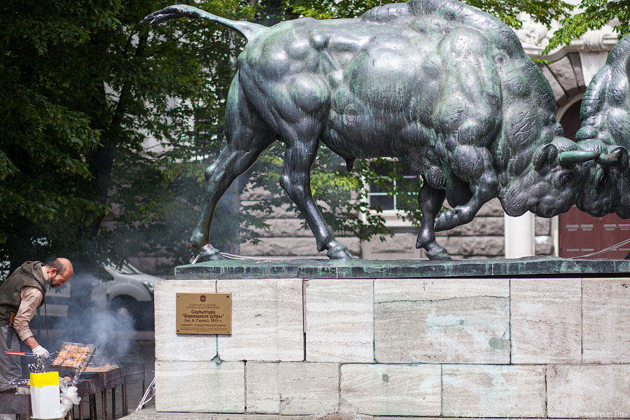 Шашлычный дым на фоне скульптуры «Борющиеся зубры», много лавок с картинами морских пейзажей, аквагримом по 100 рублей и глиняными свистками, воспитанницы танцевальных студий, вынужденные переодеваться на улице — на первый взгляд, пешеходная зона такая же, как и год, и два, и три назад. «Ничего нового — и так все десять лет», — с сожалением говорит своему супругу женщина, идущая мимо.