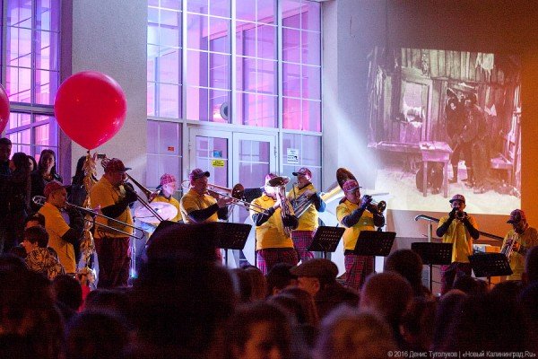 Поздним апрельским вечером перед входом в корпус на Университетской многолюдно и шумно. Духовой оркестр «Kenigsberg brass band» играет музыку из известных кинофильмов, на стены здания проецируются
