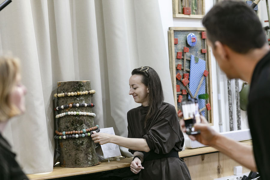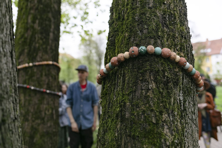 Здесь же можно увидеть холодные камни, бережно закутанные в вязанные крючком палантины, дерево с браслетами из керамических бусин, тетрадные листы с алгоритмами, на которых проступают листы гербария. Это лишь несколько из серии работ, представленных в первом зале проекта «Опыт касаний. Начало» в пространстве «Сигнал». Каждая из представленных работ — про собственный опыт касаний участников, про прикосновения, с которых начинается жизнь, отношения, любовь и даже смерть здесь означает «переход» и сложное начало новой жизни для тех, кто попрощался с близкими.