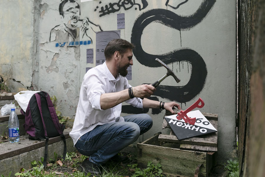 Александр берёт лист бумаги, на котором на сером фоне напечатано «Помни меня», мнёт и наклеивает на стену. «Это интервенция. Примет ли город — неизвестно, завтра этого листа уже может и не быть. Поэтому маршрут называется „Опыт касаний. Временно“», — рассказывает Дубровский. Часть объектов действительно оставались на улицах лишь незначительное время — исчезли браслеты из керамических бусин из сквера Шопена, пропала ручка на двери, ведущей в дерево, доска с надписями-антонимами, разделёнными своеобразным топором... Но тем интересней ходить по утопающим в зелени улочкам Калининграда от «Сигнала» до «Авантюриста», а затем «Бара Советов», чтобы увидеть и почувствовать, принял ли город арт-интервенцию современного искусства.