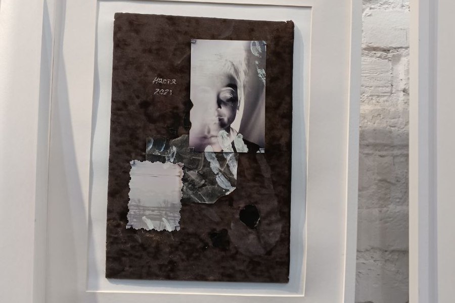 Ещё одна работа — коллаж Анастасии Кривицкой из Санкт-Петербурга с мягким и ласковым названием «Бархат». На бархатной основе, которой можно коснуться и почувствовать, как в детстве держал в руках старые бабушкины и родительские фотоальбомы с такими же обложками, четыре страницы семейных фотографий. Кадры из детства наслаиваются друг на друга, рядом надписи маминой рукой, на глянцевой поверхности снимков — отпечатки пальцев. Последняя фотография — негатив с ускользающим лицом ребёнка — это всё о детских воспоминаниях, об умершей 15 лет назад матери, пронзительном опыте переживаний её прикосновений, безвозвратно ушедшем.