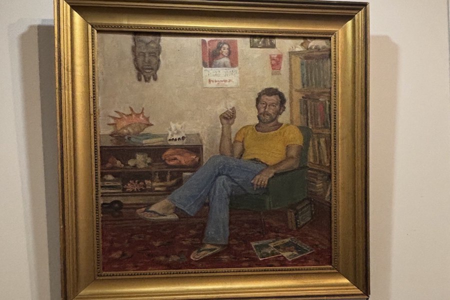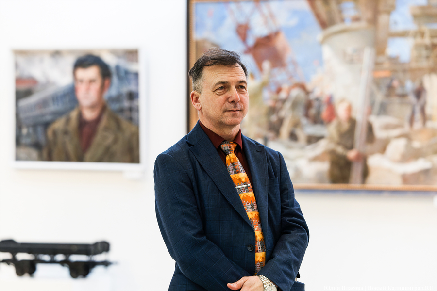 Рядом совсем другая работа, написанная Вениамином Бирюковым примерно в то же время. На ней тоже — человек труда. Мы это сразу понимаем, несмотря на то, что изображенный мужчина не стоит у станка, не закидывает невод в море и не варит сталь. Он просто сидит в кресле. На нём модная майка и явно не отечественного производства джинсы. На ногах — шлепанцы. Рядом — радиоприемник. Тоже, скорее всего, импортный. На стене комнаты — календарь с женщиной (одетой, но все же какой-то не по-советски легкомысленной) и африканская маска. На тумбочке большая морская раковина. Калининградцы сразу считывают образ. Конечно, это рыбак. Пришел из рейса и отдыхает.