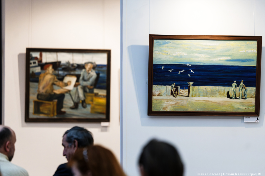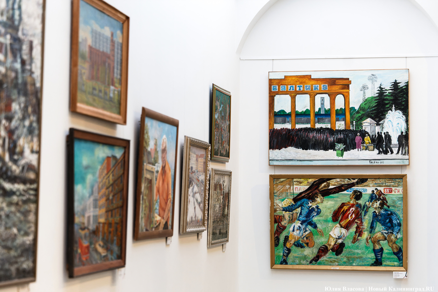 На выставке можно увидеть работы Михаила Пясковского, Александра Балабаева, Олега Пьянова, Саргиса Гогоряна, Бориса Булгакова, Владимира Корнилова, Адольфа Шевченко, Израила Гершбурга и многих других известных мастеров советского периода. В основном это произведения из фондов музея. Но не только. Как рассказала Валентина Покладова, две работы Гершбурга — «Стадион «Балтика» и «Футболисты» — предоставлены семьей, к сожалению, ушедшего от нас в 2018 году художника. На первой изображен центральный вход на стадион «Балтика», у которого столпились болельщики, изображенные в виде некой черной тучи. Контрастируют с ней две фигуры торговок семечками, на которых яркая, бросающаяся в глаза одежда. Что хотел сказать автор? Возможно, что футбольные фанаты — это некая стихия, своего рода природное явление.