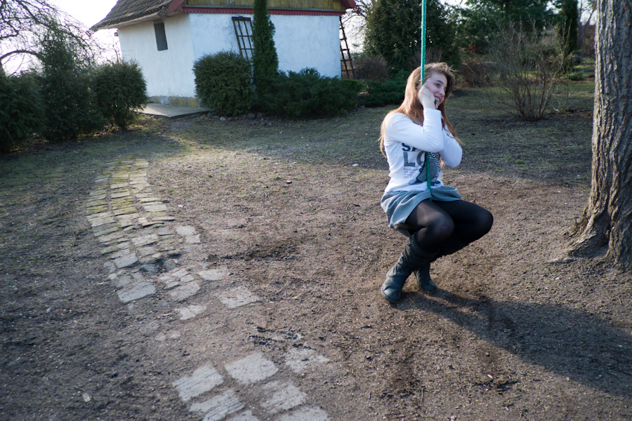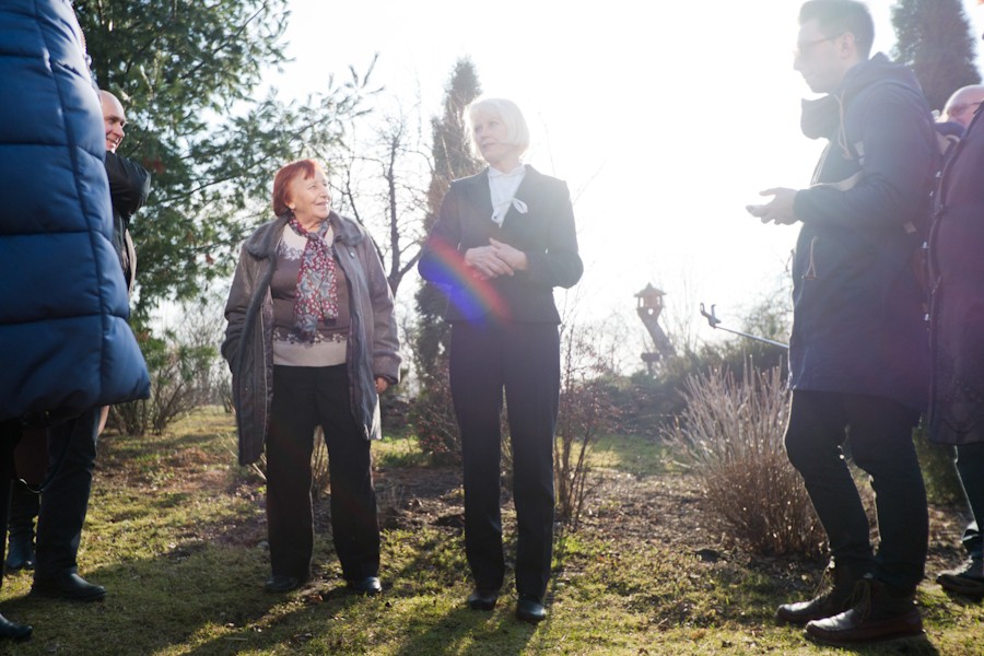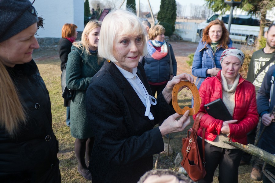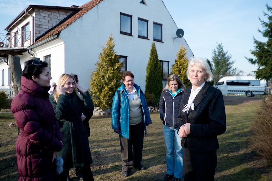 Экскурсию хозяйка начинает с прогулки по прилегающей территории музея: аккуратный газон, декоративные растения, миниатюрные постройки. Всё это смотрится в русской глубинке, как роза в чистом поле, диковинно: за забором виднеется полузаброшенное здание с ветхой крышей, обваливающееся на глазах. Рассказ Инессы Савельевны с интересом слушают приезжие калининградцы. Школьники, студенты, их родители, даже бабушки — всего с полтора десятка калининградцев.