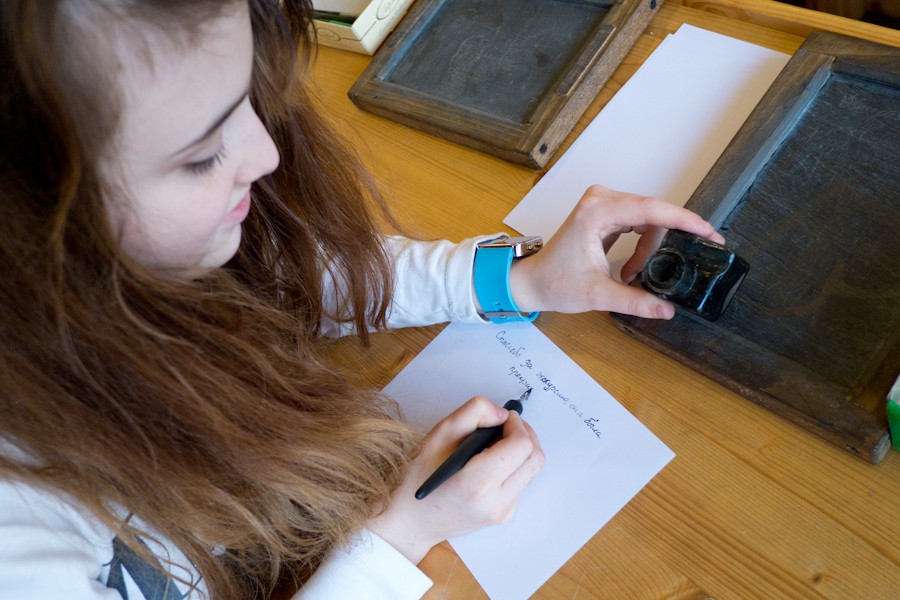 «Давайте напишем на доске: „Heute ist der 8. märz“ (сегодня 8 марта — прим. „Афиши Нового Калининграда.Ru“). На все предметы здесь был один учитель. Тут помещалось 46 детей, а во втором помещении сидел 51 человек. Перед вами фотография класса, в котором вы сейчас находитесь. Вот — такие же парты. Это фото 1938 года — видите, портрет Гитлера висит — но мы, конечно, его вешать не стали», — замечает женщина и показывает приспособления, на которых дети писали, — грифельные доски. По форме они похожи на нынешние планшеты. Писали на них специальным грифелем. Хозяйка рассказывает, что они нашли много грифелей во время ремонта. А недавно ей привезли целую пачку из Германии — 1930 года выпуска.