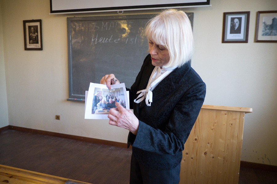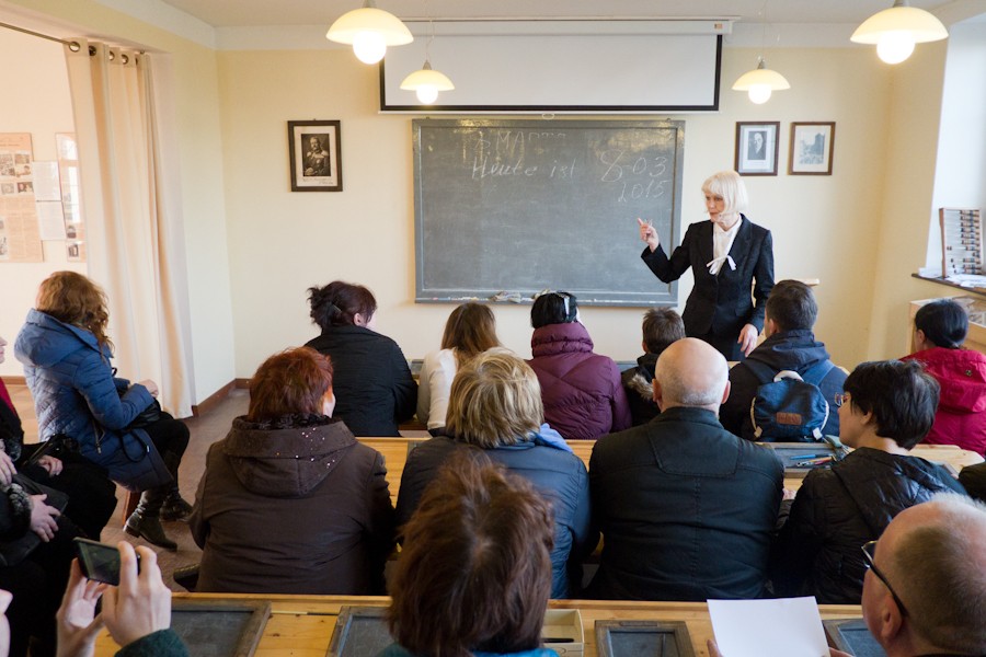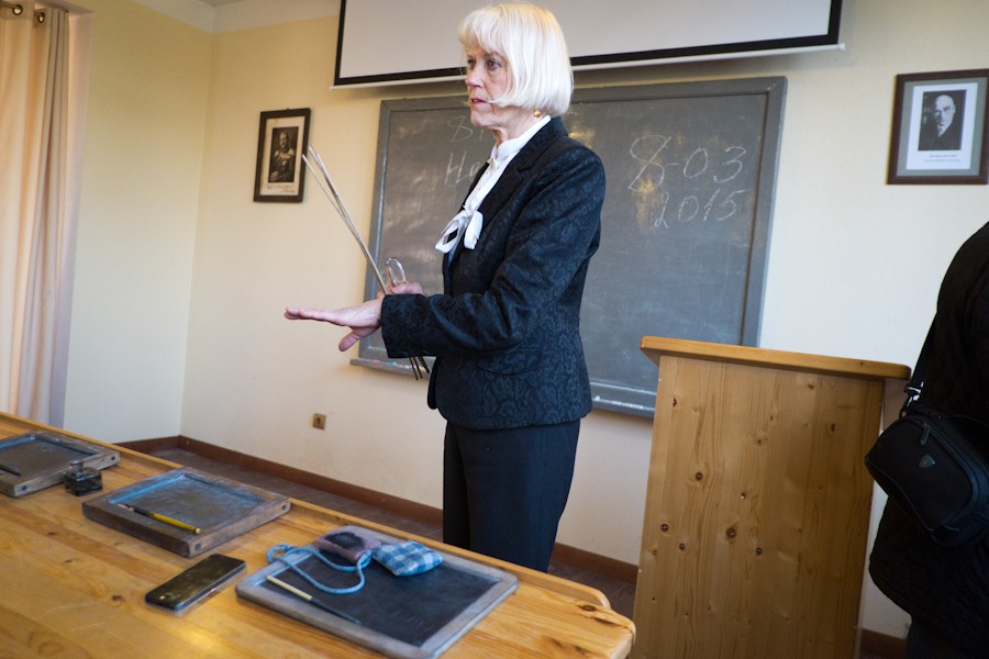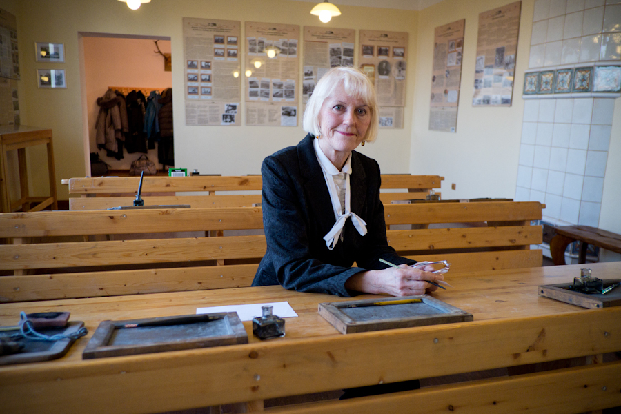 Скамейки в отреставрированном помещении стоят в три ряда. В их воссоздании Наталичам помогал герр Хайберманн — ученик школы, живший в соседнем доме. На стене в окружении портретов висит серая, как типичное калининградское небо, доска — точь в точь такого же цвета, как оригинальная, старая. Рядом кафедра — таких же форм и размеров. Инессу Савельевну в строгом чёрном костюме можно принять за всамделишного учителя из Восточной Пруссии. Впрочем, это единственная строгая деталь её образа. Хозяйка музея увлечена рассказом об учебном процессе далёкого прошлого. Так живо и ясно рассказывает, что невозможно оторваться.