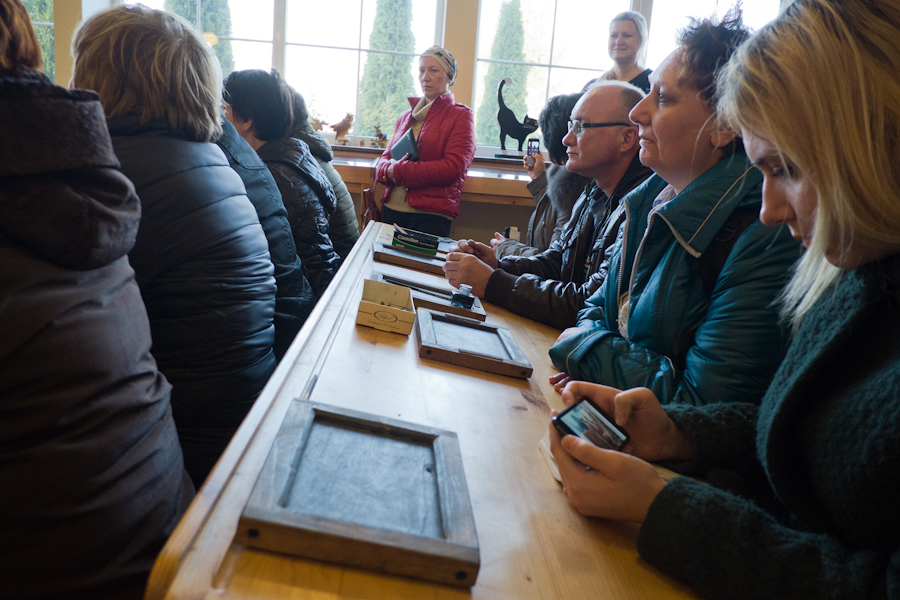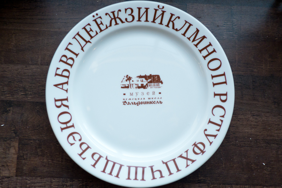 Постепенно время экскурсии заканчивается. Хозяйка демонстрирует сувениры, которые подготовила для гостей. Среди них — точная копия фарфоровой тарелки, с помощью которой дети в Восточной Пруссии изучали алфавит. На ней по кругу изображены буквы. «Я стараюсь разрабатывать функциональные сувениры. Чтобы не пылились на полке, а верно служили. Представьте: мама клала еду напротив буквы и спрашивала ребёнка, на какую из них она смотрит. И он их быстро запоминал. А это — точная копия. Я сделала тарелку с русским алфавитом, заказала в Польше на фарфоровом заводе „Lubiana“. Одна буква здесь пропущена — специально, чтобы её ребёнок запомнил особо. Нет буквы „ы“». Сувениры берут себе если не все посетители, то каждый второй — точно.