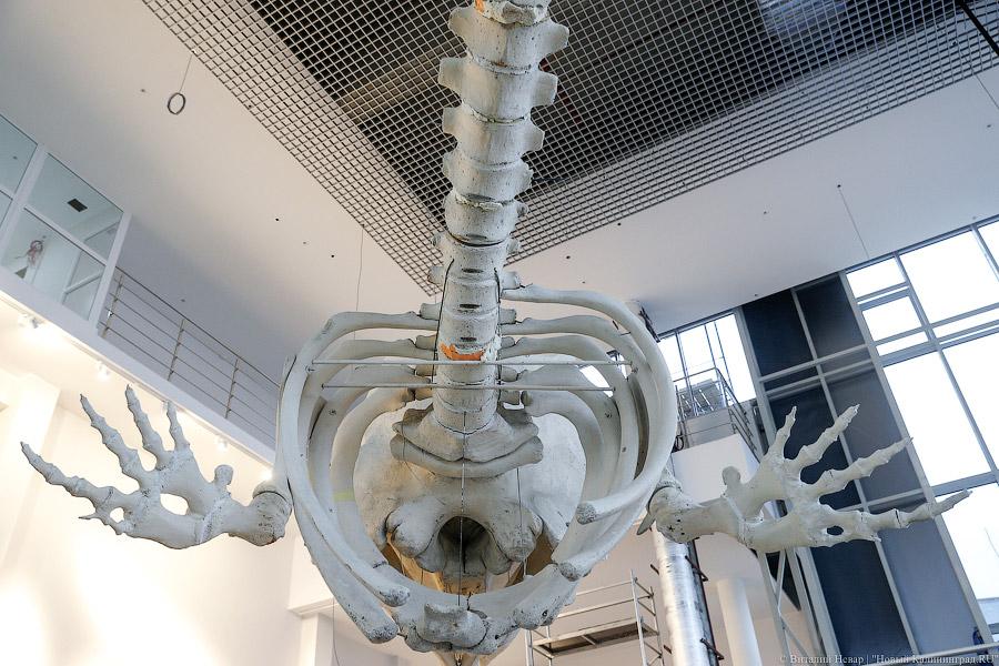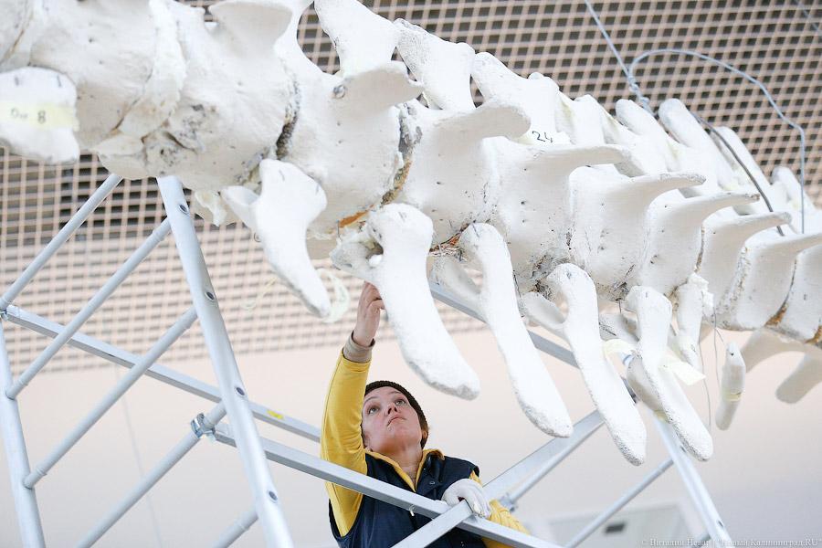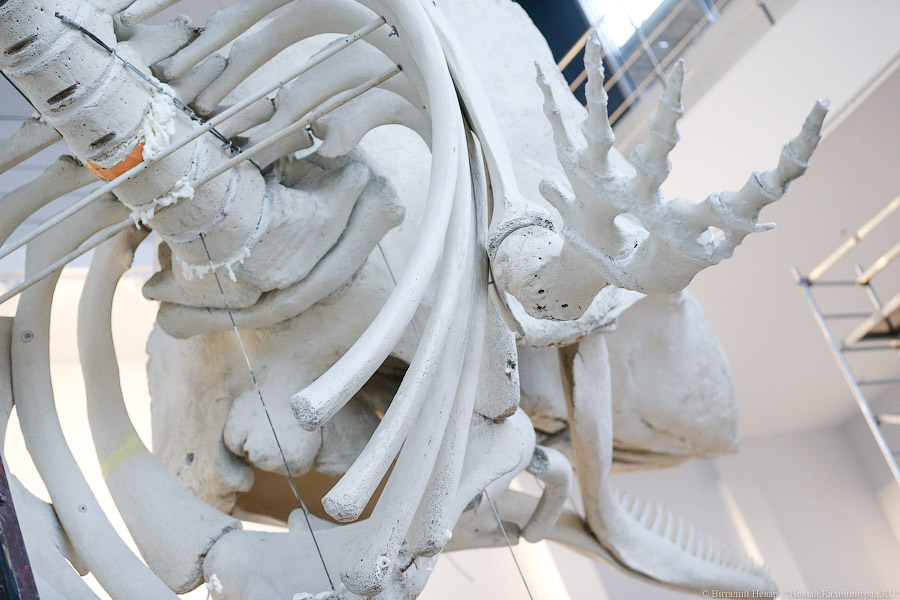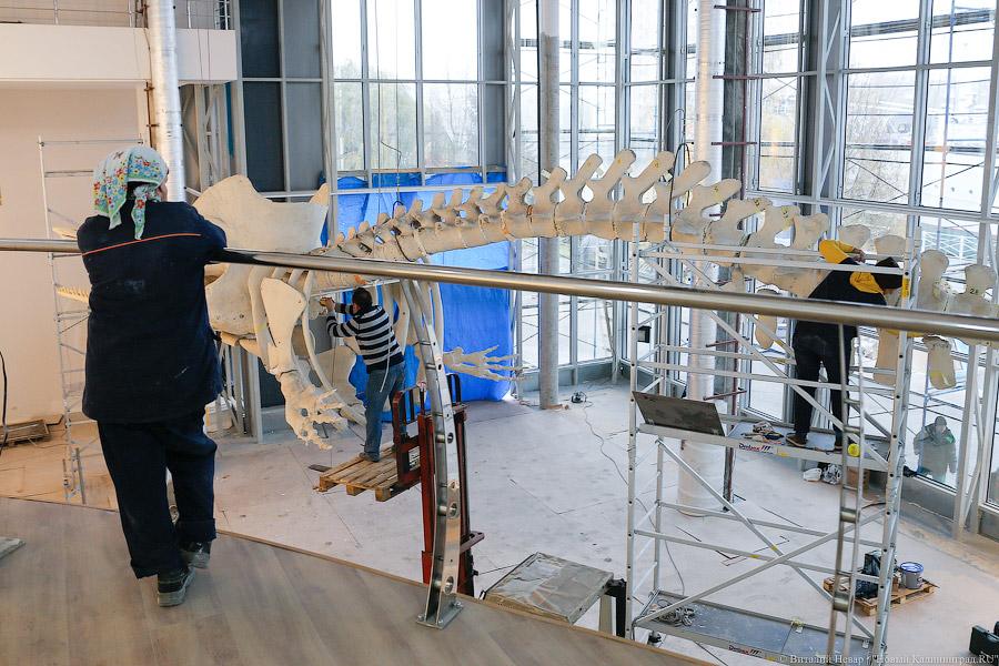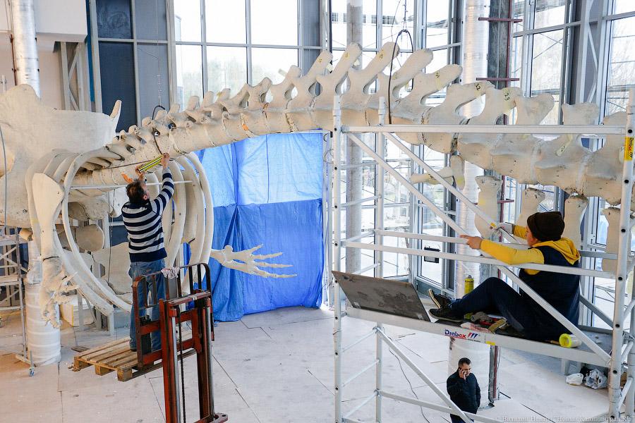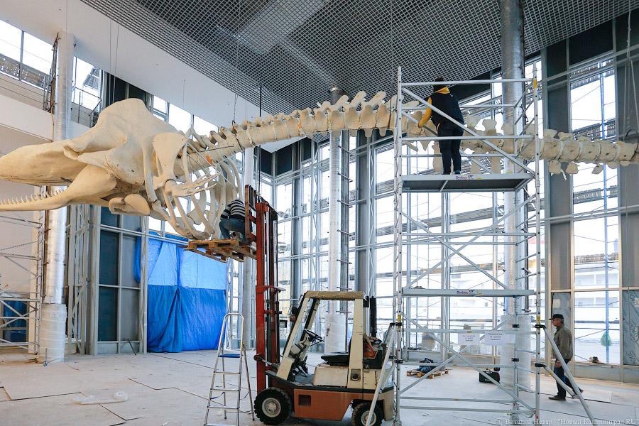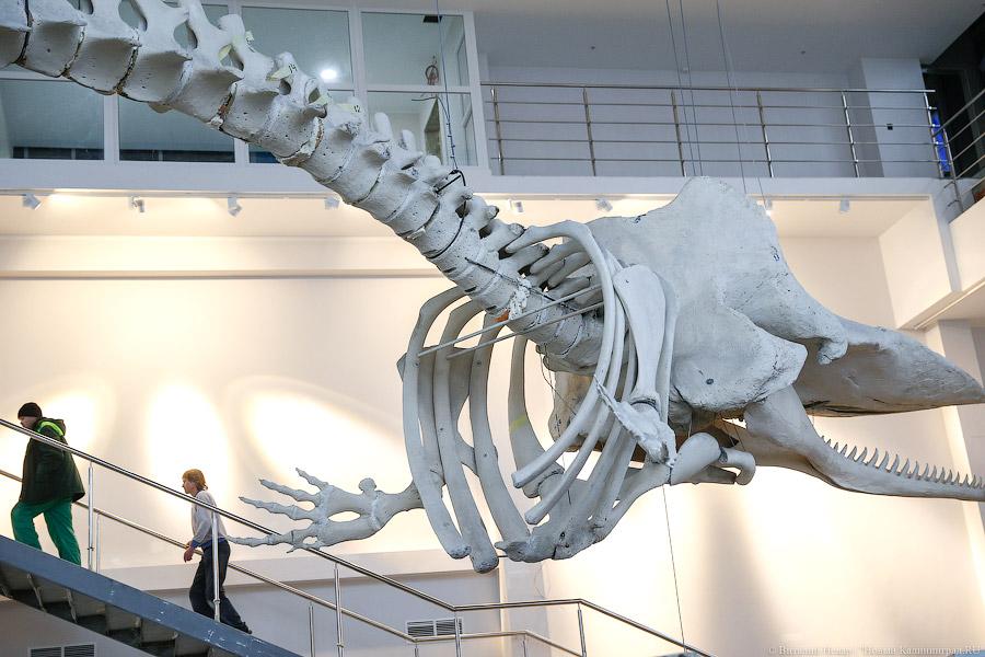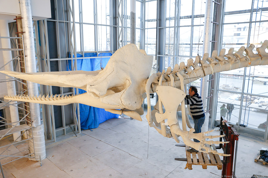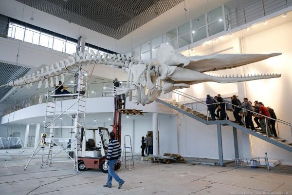 В новом корпусе Музея Мирового океана — Фондохранилище — приступили к монтажу скелета крупнейшего в России кашалота. Сотрудникам учреждения предстоит собрать чуть более ста костей в целый скелет морского гиганта весом 2,5 тонны и подвесить к потолку нового корпуса. После того как работа будет завершена, он станет частью экспозиции «Глубина».