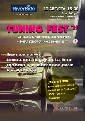 - финал конкурса «Miss Tuning Fest'17», где 7 обворожительных красоток, будут бороться за главный приз от генерального спонсора — Турфирмы «Азбука Туров» — туры из Калининграда!