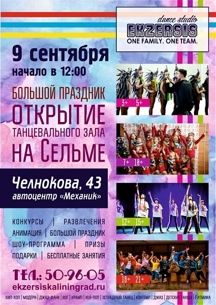 В честь открытия танцевального зала на Сельме студия современного танца «Экзерсис» организует праздник для детей, подростков, молодежи и родителей! Праздник будет проходить для всех желающих. Приходите по одному, с друзьям, с родителями или, наоборот, с детьми, если вы родитель! Самое главное, что выступления танцоров, игры, развлечения и призы ждут всех участников праздника!