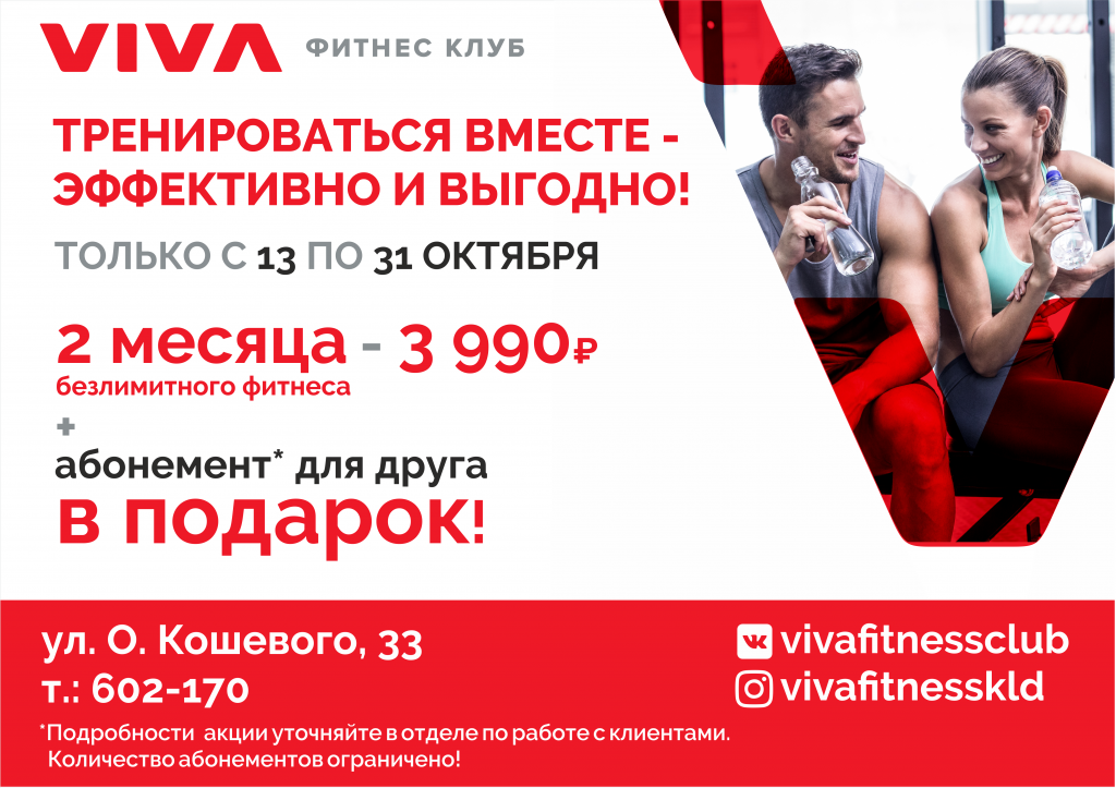 Приглашайте своих друзей в фитнес-клуб в VIVA потренироваться вместе с вами абсолютно бесплатно! Воспользуйтесь нашим специальным предложением! Только до конца октября вы приобретаете абонемент на 2 месяца безлимитного посещения фитнес-клуба VIVA всего за 3990 рублей, а мы дарим вам вторую клубную карту для друга! Не пропустите, количество абонементов ограничено! Мотивируйте друг друга и двигайтесь к своей цели вместе!