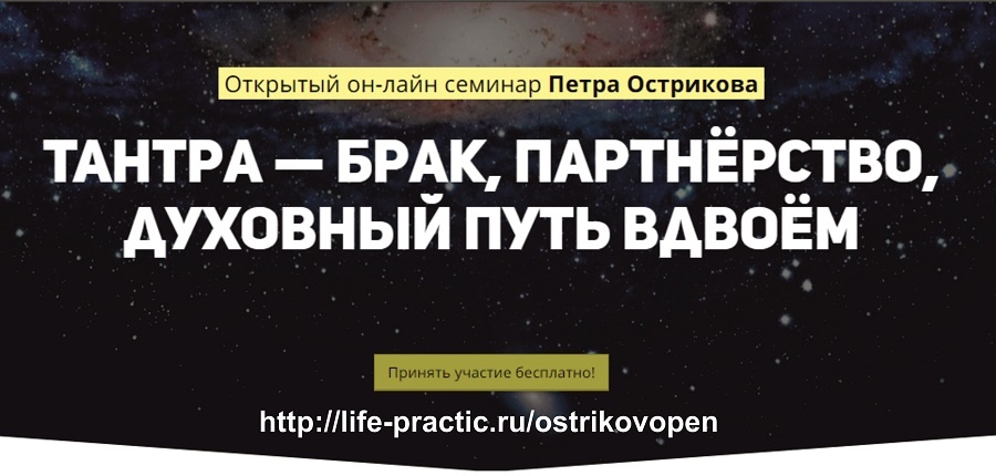 В Калининград приезжает Петр Остриков — известный в России ведущий тренингов по Тантре — глубинной психологии в отношениях мужчины и женщины. За его плечами 30 лет врачебной практики, 16 лет проведения тренингов по Тантре в Сибири и по всей России, более 5000 индивидуальных консультаций, 35 лет успешного брака; медицинское, психологическое и психотерапевтическое образование, изучение йоги, тантры, астрологии и других древних практик.