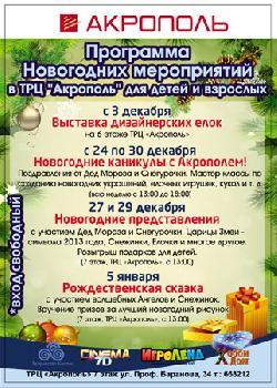 Также напоминаем, что до 5 января в ТРЦ "Акрополь" объявлен конкурс на лучший детский новогодний рисунок! Итоги будут подведены 5 января, во время очередного детского праздника на 7 этаже комплекса, а именно "Рождественской сказки" с участием волшебных Ангелов и Снежинок!