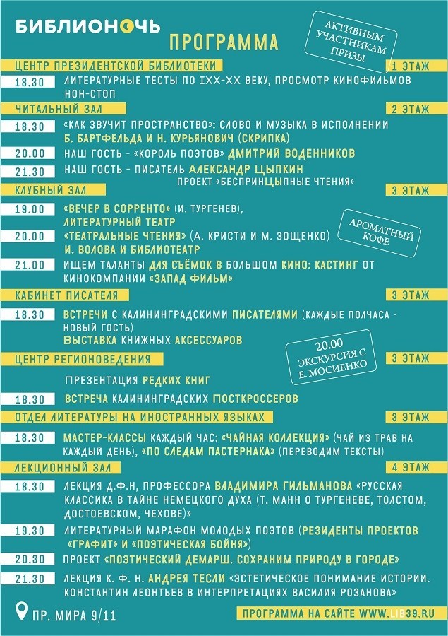 Традиционная всероссийская акция пройдет в библиотеках Калининграда 20 апреля. Основной точкой на карте «Библионочи-2018» станет Калининградская областная научная библиотека на проспекте Мира, 9/11. Учреждение подготовило обширную программу праздника книги под названием «Нелинейное время», она начнется здесь в 18.30. Акция рассчитана на посетителей разных возрастных категорий.