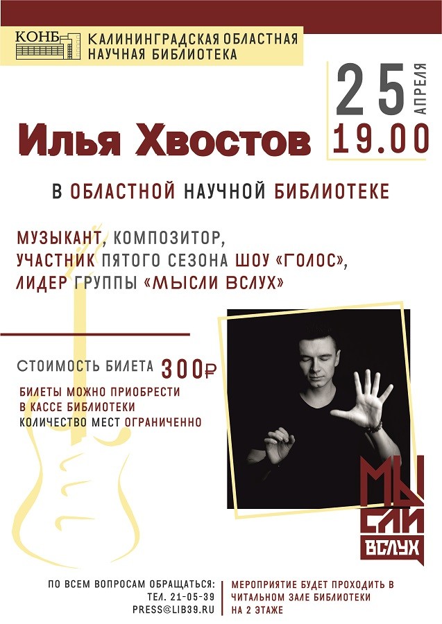Не успела в Калининградской областной научной библиотеке отгреметь Библионочь, как учреждению вновь не до сна. В среду, 25 апреля, здесь состоится творческая встреча с музыкантом, композитором, участником пятого сезона шоу «Голос», лидером группы «МЫсли Вслух» Ильёй Хвостовым.