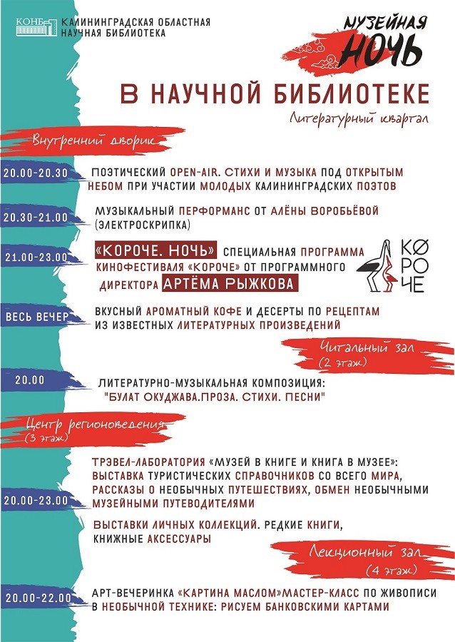 Во внутреннем дворике библиотеки состоится поэтический open-air — здесь прозвучат стихи молодых калининградских поэтов, затем свой музыкальный перфоманс представит скрипачка Алёна Воробьёва (электроскрипка). Главным событием вечера станет начало работы кинотеатра под открытым небом — специальную программу кинофестиваля «Короче» — «Короче. Ночь» в библиотеке лично представит программный директор фестиваля Артём Рыжков.