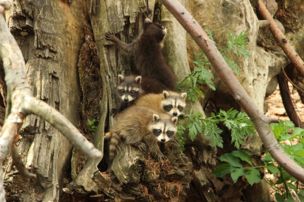 Киперы повесили в вольере енотов связки веток с крупной алычой. Среди алычи были спрятаны орехи и сухофрукты. Ветки укрепили таким образом, чтобы животным пришлось потрудиться, прежде чем добыть угощение. Несмотря на то, что еноты способны удержаться на самой тонкой ветке и проползти по канату вниз головой, им пришлось нелегко.