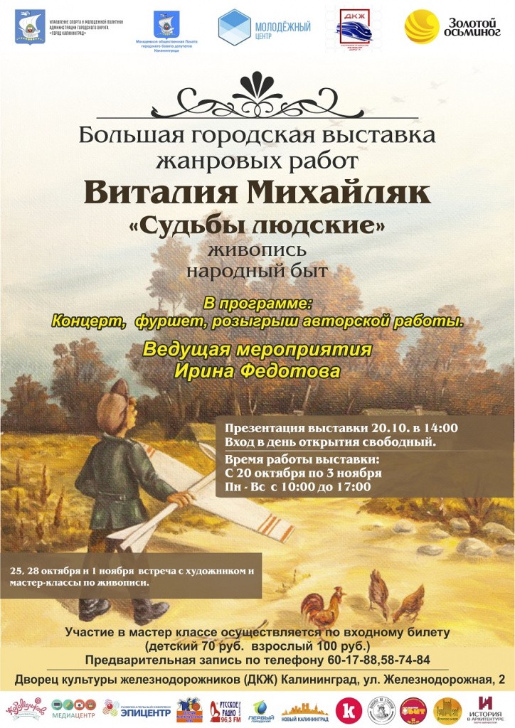 С 20 октября по 3 ноября при поддержке Администрации Калининграда в Доме культуры железнодорожников проходит большая городская выставка художника Виталия Михайляка. Основная тема картин выставки — «Судьбы людские».