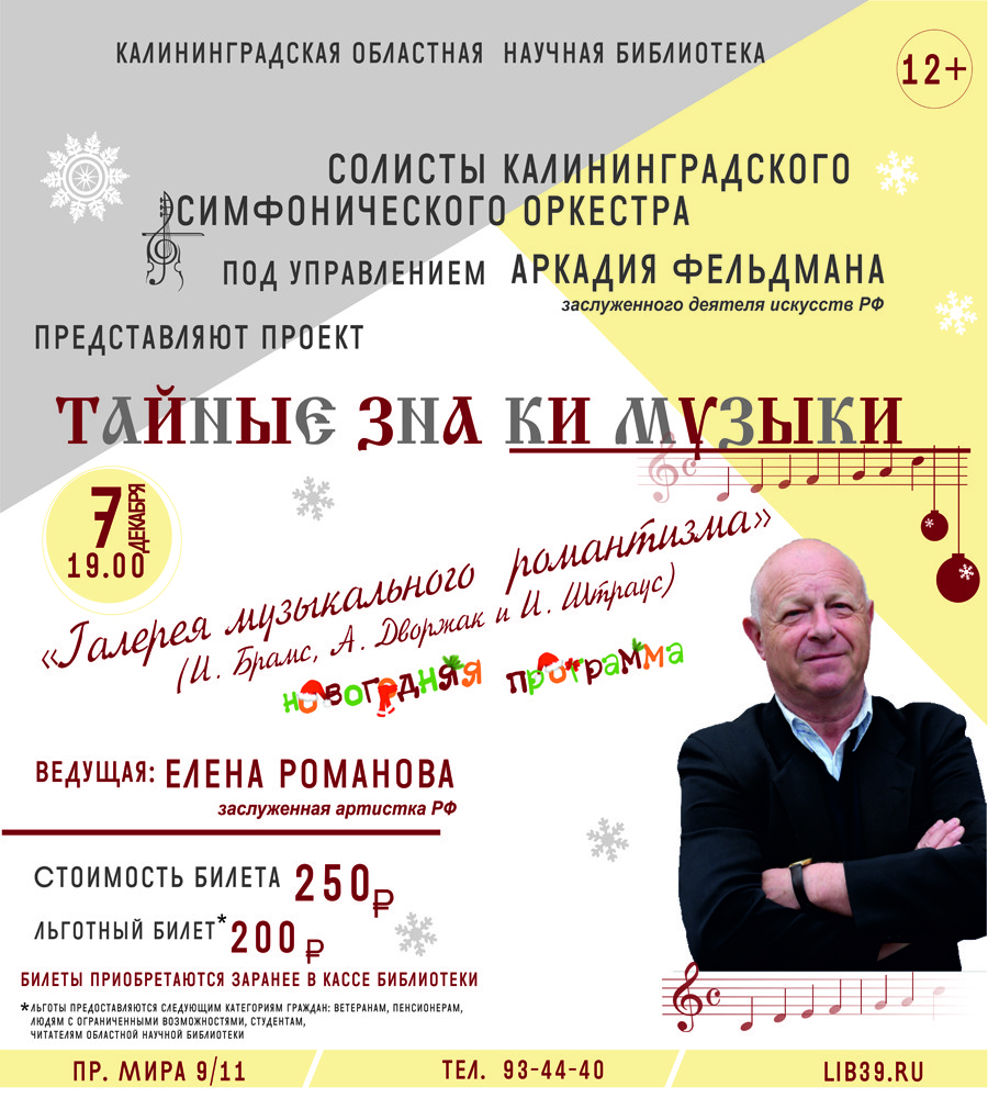 В Калининградской областной научной библиотеке продолжается проект «Тайные знаки музыки». На этот раз вечер будет особенным: солисты Калининградского симфонического оркестра под управлением Аркадия Фельдмана представят публике специальную праздничную программу «Новогодний оркестровый серпантин», в которую войдёт танцевальная музыка И. Брамса, А. Дворжака и И. Штрауса.