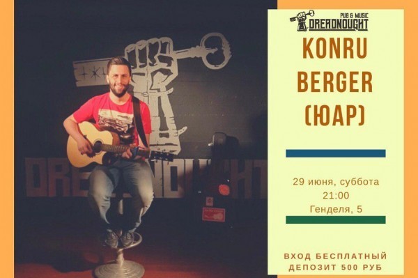 «Дредноут» продолжает искать независимых талантливых музыкантов и поддерживать их, предоставляя им возможность выступить, собрать свою аудиторию и осуществить мечту! Один из таких мечтателей выступит 29 июня в 21:00 — Konru Berger (ЮАР).