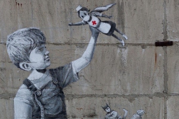 Аналогичное граффити в начале мая сделал Бэнкси в коридоре больницы в Саутгемптоне. Там же художник оставил для работников записку со словами: «Спасибо за все, что вы делаете. Надеюсь, мой рисунок немного осветит это место, даже если он черно-белый». Позже представитель Бэнкси рассказал, когда все ограничения по коронавирусу будут сняты, рисунок выставят на аукционе, чтобы собрать средства для благотворительных организаций Национальной службы здравоохранения Англии.