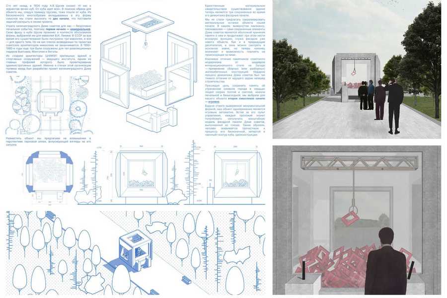 Предложенный арт-объект кубической формы, «являясь строго выверенной фундаментальной формой, одновременно является игровым автоматом», отмечают создатели. «Встав за его пульт управления, каждый желающий сможет попробовать заполучить масштабную модель фасадной панели Дома Советов из плюща. Таким образом, человек оказывается причастным к процессу его бесконечной, запертой в «вечный» контур куба, (де)конструкции», — поясняют они свою идею.
