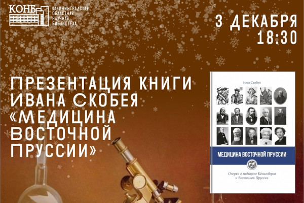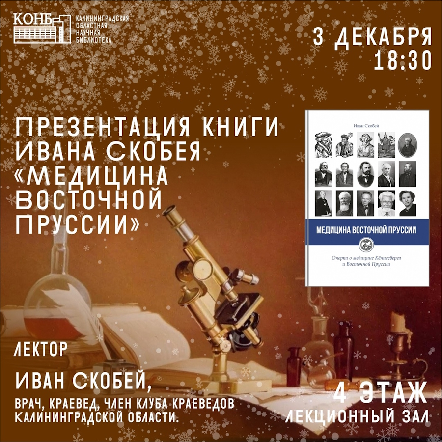 Изображение: страница Калининградской областной научной библиотеки в соцсети «ВКонтакте»Во вторник, 3 декабря, в Калининградской областной научной библиотеке известный в области краевед и врач-терапевт Иван Скобей представил свою книгу «Медицина в Восточной Пруссии» (16+). Она раскрывает неизвестные страницы старейшего университета Альбертина и городских медучреждений, существовавших до Второй мировой войны.