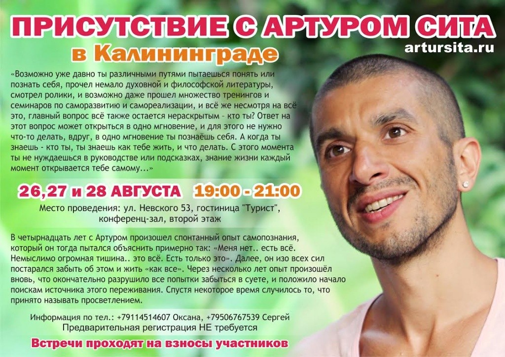 26, 27 и 28 августа в Калининграде впервые состоятся встречи с Артуром Сита, на которых каждый желающий сможет задать свой вопрос и ощутить вкус истинного присутствия.