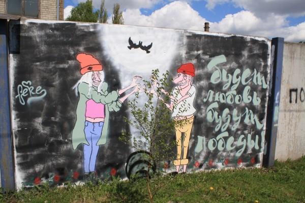 На ограждении, прилегающем к территории вагоностроительного завода на Правой набережной, появились рисунки граффити, символизирующие «войну и мир». Работы были сделаны молодыми городскими художниками в рамках
