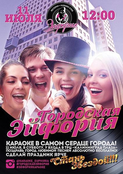 Ресторан, караоке-клуб «Эйфория» приглашает вас 11 июля в 12:00 поздравить любимый город вместе. У входа в ТРЦ «Калининград Плаза» вы сможете абсолютно бесплатно спеть любимые песни. Наша арт-группа будет создавать для вас особое настроение праздника. Самых активных ждут приятные комплименты. А также вы сможете сделать памятные фотографии. Обещаем, наш фотограф не пропустит ни одну улыбку. Стань звездой с рестораном, караоке-клубом «Эйфория»!