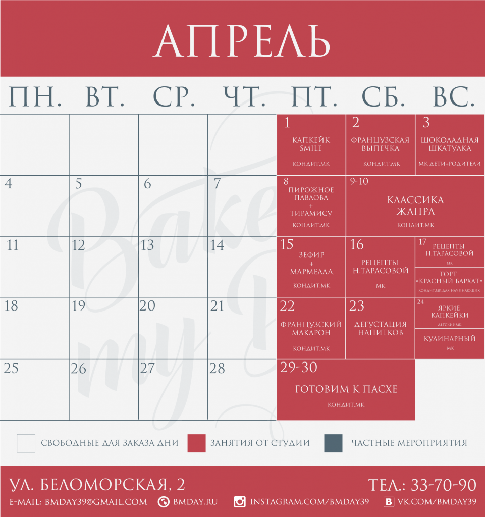 Погода начинает радовать солнцем, а кулинарная студия «Bake my day» продолжает впечатлять своих клиентов разнообразными мастер-классами, дегустациями и блестящей возможностью провести здесь любой праздник. Апрельское расписание включает в себя множество кондитерских мастер-классов разных уровней, а также дегустацию напитков, кулинарию и детские занятия. Конечно, не обошлось и без специального мастер-класса, посвящённого Пасхе, где у каждого участника будет возможность научиться готовить пасхальные изделия, а затем забрать своё творение для домашнего стола на праздник.