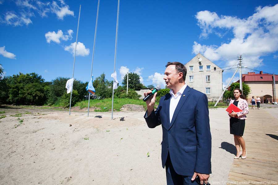 Рядом с домом выстроились в ряд пустые новенькие мольберты, точь в точь такие же, как у детей на пленере на площади. На мольбертах должны были быть закреплены пленерные работы первокурсников БФУ им. Канта и несколько листов с антикварными открытками от «Музея города Кёнигсберг», но организаторы решили перестраховаться и на случай сильного ветра просто поставили рамы на землю. Еще весной по правую руку от дома Ловиса Коринта стояла пара расселенных довоенных домов, теперь их снесли, на пустом месте насыпан песок, чуть ниже оборудован новый причал — пока что временный, но все равно красивый. На набережной установлены три флагштока — Александр Торба, Галина Заболотская и консул ФРГ в Калининграде Михаэль Банцхаф поднимают флаги. Один флаг - с гербом Гвардейска, другой — с эмблемой Художественной галереи, третий — с эмблемой общества почитателей Ловиса Коринта.