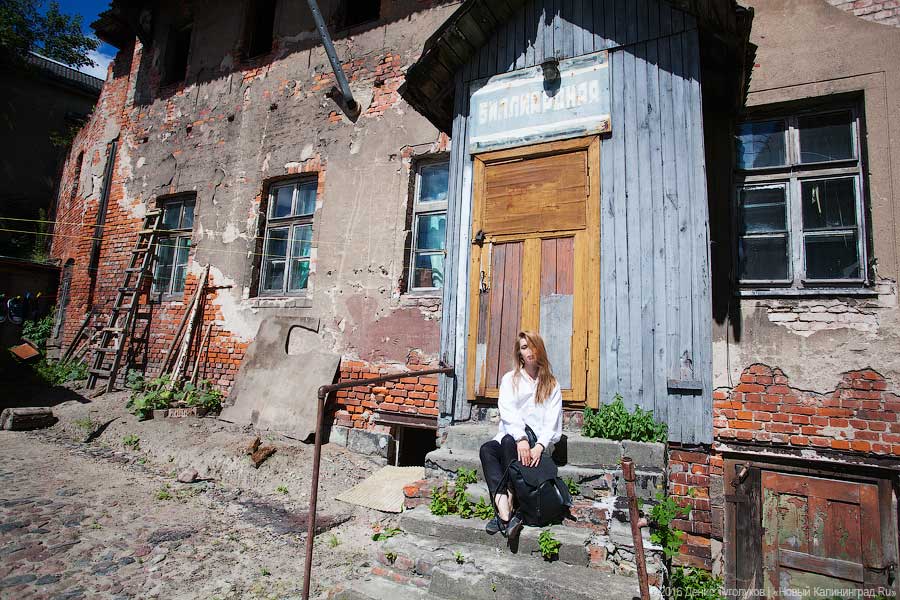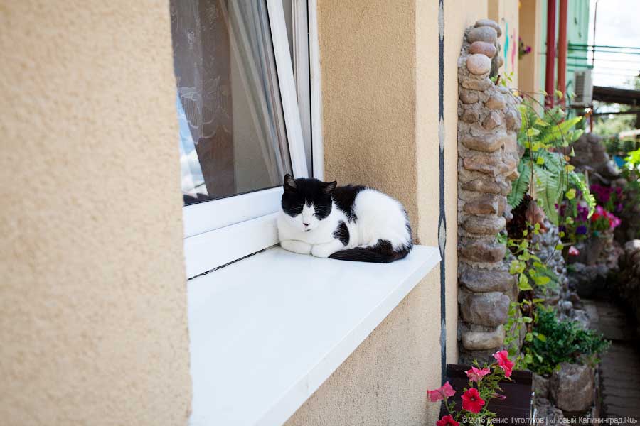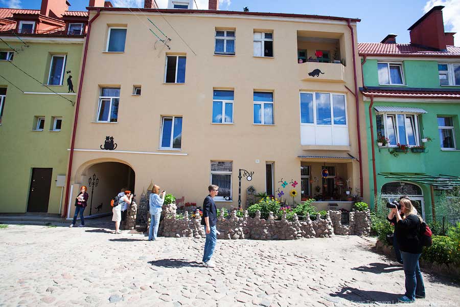 Если от разрисованной стены пройти немного вниз и завернуть в первую арку, которая будет по правой стороне, можно попасть во двор, который местные жители называют «кошачьим». Ухоженный брусчатый двор в окружении немецких домов и сараев: много цветов и зелени. Ну и много котов — настоящие коты спят в кустах, на подоконниках, крадутся по крыше сарая. Коты, нарисованные на стенах, демонстрируют чудеса акробатики. Кроме котов замечательно и то, что одно совсем обветшалое строение с бетонным крыльцом только прикидывается сараем — на самом деле еще в советские годы здесь была настоящая бильярдная при гостинице для военных. Бильярда не сохранилось, вывеска осталась.