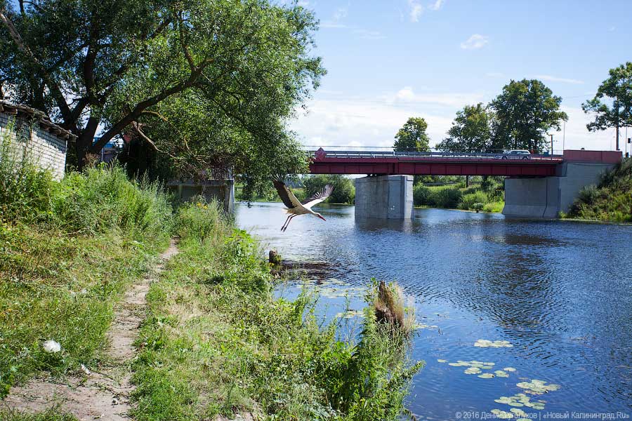 Дейма, зеленоватая вода, аист над водой и его тень внизу, кувшинки, осока, чертополох и крапива. Сорное разнотравье. На том берегу облупившаяся стена тюрьмы, которая
