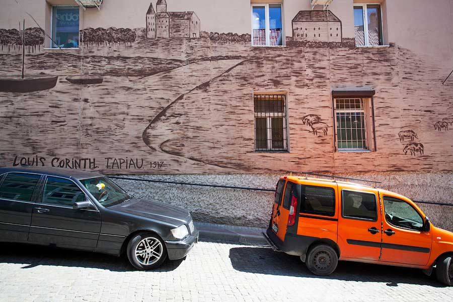 От площади мы идем к улице Горной — бывшей Бергштрассе. На торцевой стене одного из домов этой улицы в прошлом году появилась тотальная графичная роспись — версия той знаменитой акварели «Аллегории Боруссии», исчезнувшей в